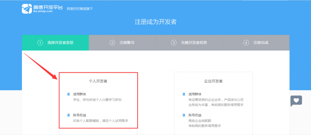 2.根据自己的需求选择开发者类型,如果是没有营业执照选择个人开发者。