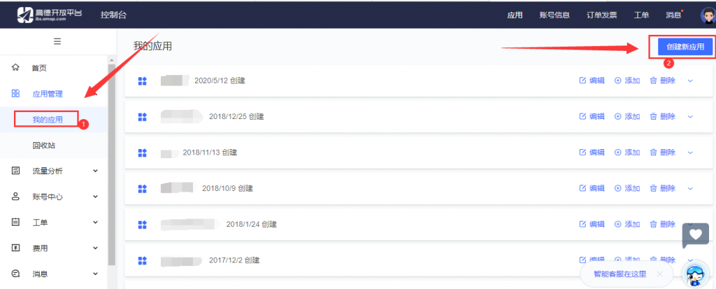 3.登陆高德地图开发者控制台,应用管理-我的应用-创建新应用,如下图所示: